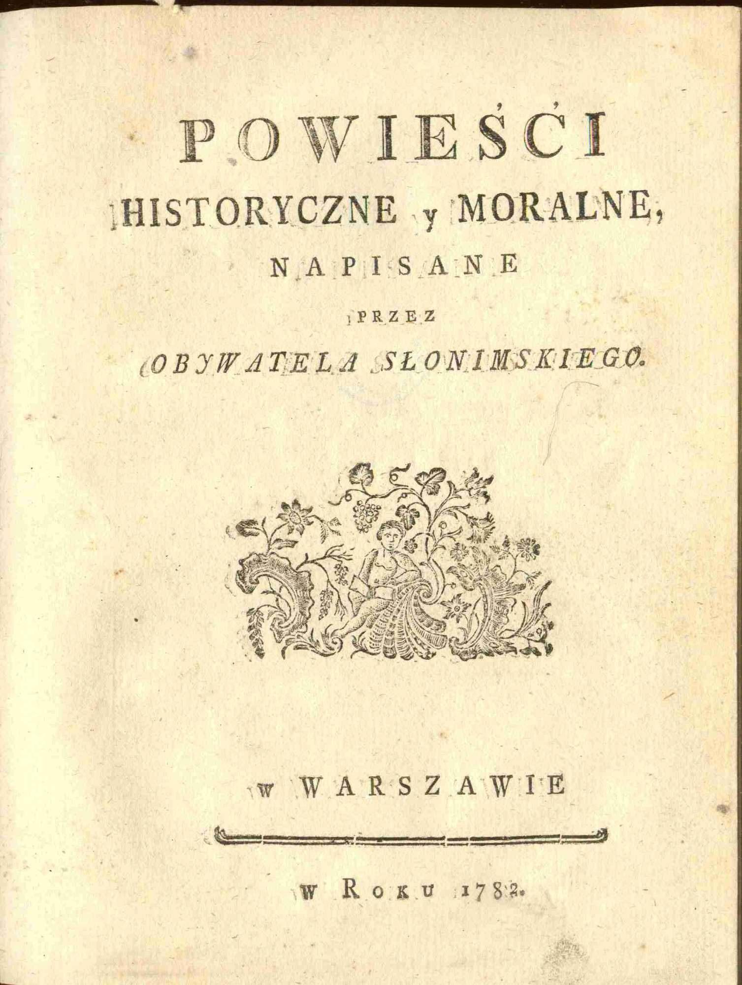 "Гістарычныя і маральныя аповесці Слонімскага грамадзяніна" аўтарства Міхала Казіміра Агінскага. Са збораў Biblioteki Narodowej.